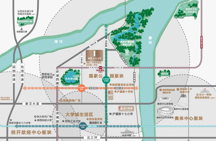 自然臻境:毗邻未央湖、世界水岸灞河、渭河三大水系,更有西安浐灞湿地公园、未央湖公园等生态公园环伺。畅达交通:坐拥三横(秦汉大道、北二环、北三环)三纵(北辰大道、未央路、太华路)路网体系;临近地铁10号链接城市精彩。