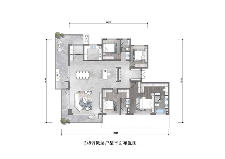 248平四房两厅三卫,19.4米大面宽,南向双套卧,三明卫的户型设计,主卧同样也设计有步入式衣橱,让您生活满满的仪式感