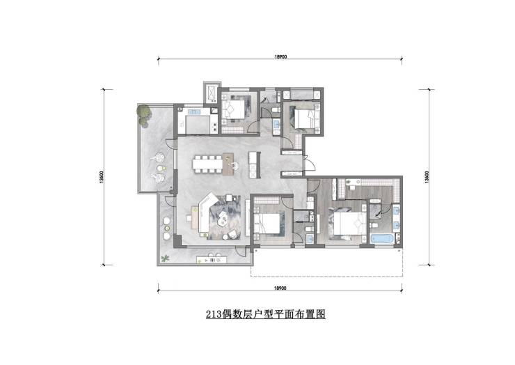 213平四房两厅三卫,18.9米大面宽。南向双套卧,三明卫的户型设计,主卧设计有步入式衣橱,极致生活享受。