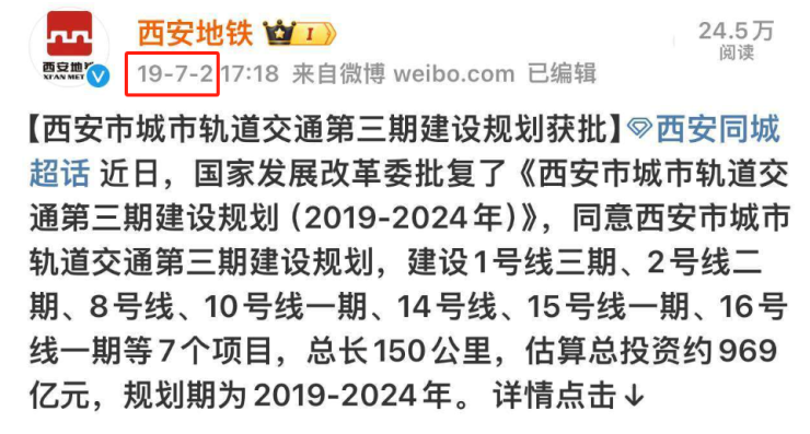 我们可以根据地铁三期的时间节点来进行推测。2016年10月西安地铁三期首次在官方发布环评公告,到了2019年6月,国家发改委才真正批复三期线路,也就是说,三期从环评到批复,用32个月。