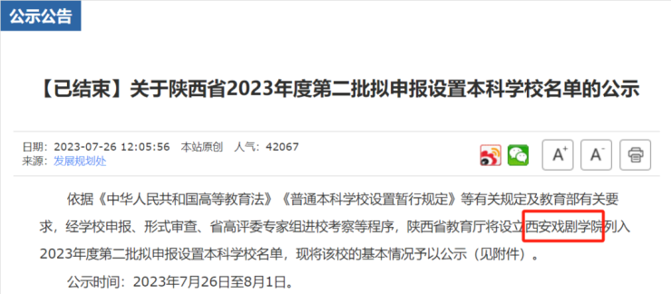 关于陕西将设立西安戏剧学院的消息,是在2023年7月份传出的。2023年7月26日,陕西省教育厅发布《关于陕西省2023年度第二批拟申报设置本科学校名单的公示》。