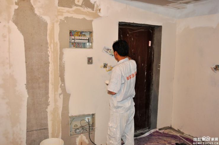 工人处理完基层后在批腻子。