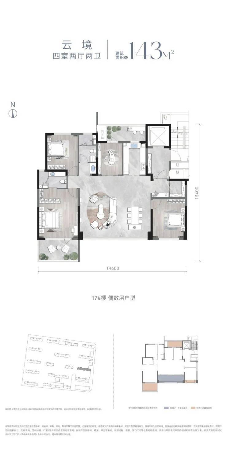 其143㎡户型,四室两厅两卫的设计,以17#楼偶数层的户型来看,户型方正,南向面宽大,无论是风景还是阳光都能扑面而来。