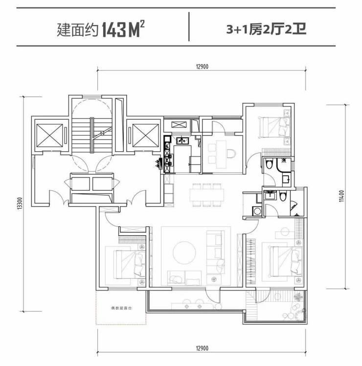 143㎡户型为3+1房2厅2卫,该户型主要分布在小高层。