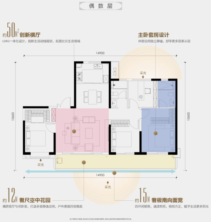朝向方面,该户型是四房朝南,整体南向采光面约14.9米,室内通透明亮,视野更好。主卧同样是套房设计,安静私密。无论是客厅、餐厅、主卧、还是客卧,都做到了空间零浪费,空间利用率高。
