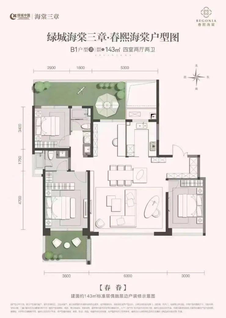 项目建面约143㎡的户型,其偶数层户型带有南北双露台。