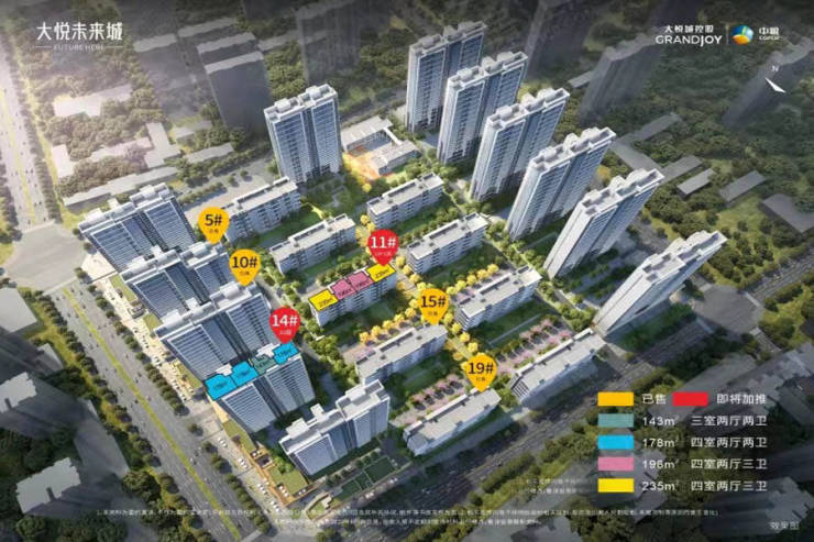 中粮大悦未来城【基本信息】(首发地块) 占地面积:约164亩 总建面:约35万方 绿化率:约35% 容积率:3.5 楼栋信息:21栋 楼栋层数:8层-33层 规划户数:约2215户 面积区间:规划约125-175㎡宽幕平层 、约143-226㎡空中庭院洋房