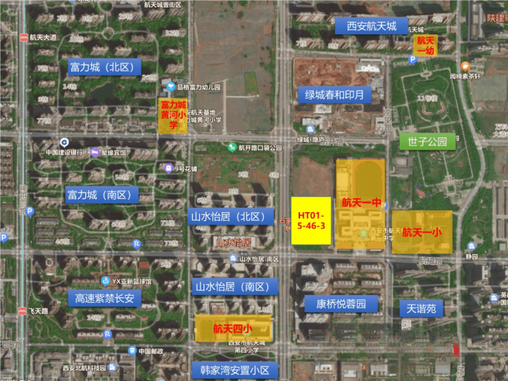 地块东侧紧邻的就是航天一中、航天一小,东南侧为航天一幼,周边还有航天四小、西安航天基地富力城黄河小学等学校,教育资源相对来说比较丰富。