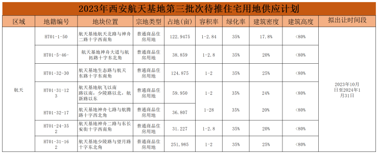 该地块位于航天基地航拓路与神舟大道十字东北角,土地面积38.859亩(住宅38.054亩,商服0.805亩),土地用途为住宅、商服,容积率不大于2.8,建筑密度不大于20%,绿地率不小于35%,地上计容建面上限为72537㎡,建筑限高80米(且满足通航机场限高要求)。