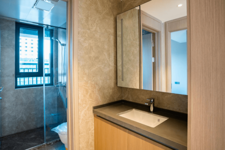 燃气灶、油烟机采用方太,五金卫浴均为科勒、摩恩,装标优越清晰可鉴。飘窗台、门槛石,采用石材精心铺装,并且在交付之前,十分贴心地对这些珍贵的材质,进行了贴膜覆盖,最大程度减少施工以及验收环节的磨损。