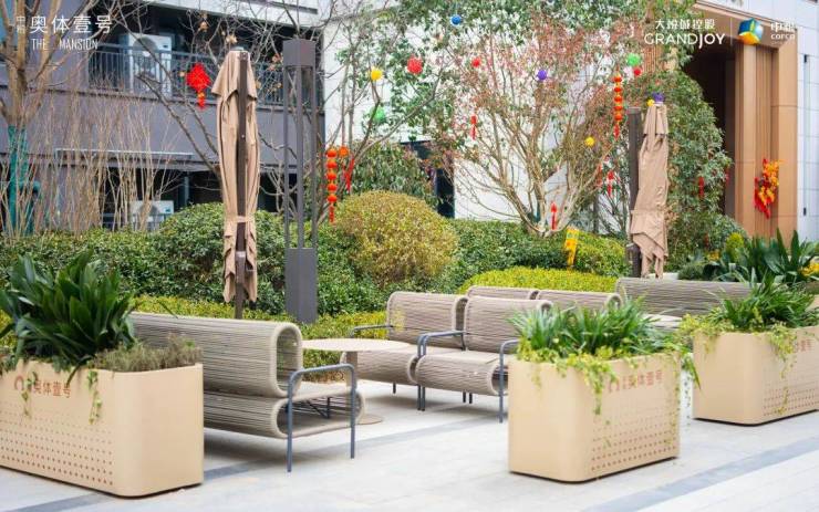 而在消防通道这个区域,在满足硬性的验收标准之外,也进行了更多的绿植营造,奢享感直线进阶,配合精心设置的休闲卡座,让社区里也有了难得的度假氛围感。