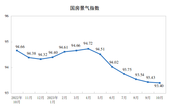 与此同时,1—10月份,房地产开发企业到位资金107345亿元,同比下降13.8%,10月份,房地产开发景气指数(简称“国房景气指数”)为93.40,是从去年10月份以来的最低点。