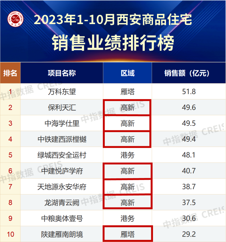 也正因如此,西安区域房价最高的板块从曲江流转到高新,但始终都未逃脱出城南片区。更重要的是,根据中指研究院发布的《2023年1-10月西安房地产企业销售业绩TOP10》名单显示,城南就占了七席!