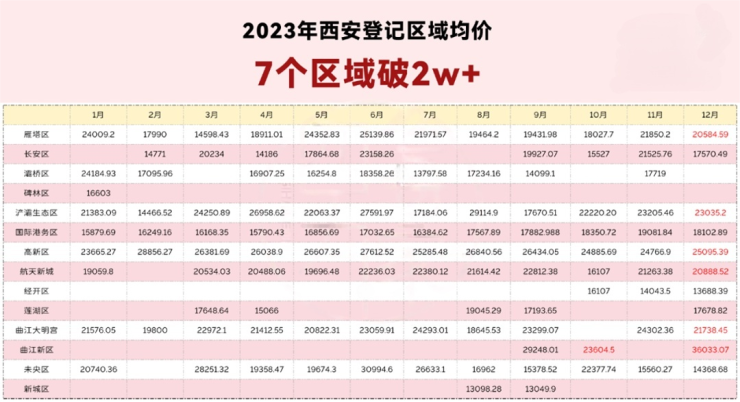 遥遥领先于市场的,并不是大家熟知的高新区,而是曲江新区,以全年登记均价33989.88元/㎡登顶今年西安区域均价榜第一。