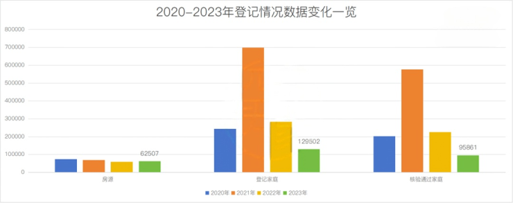 根据统计,2023年1-12月,主城区内共计登记盘次383次,供应房源62507套,吸引登记家庭129502组家庭,通过核验家庭95861组。