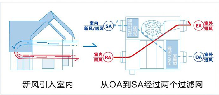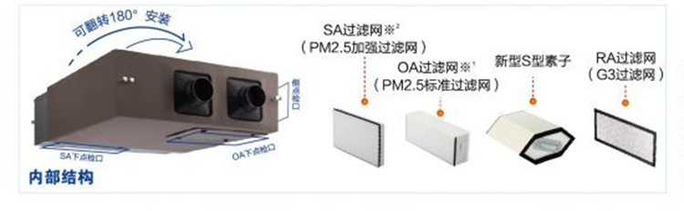 冬季低温环境往往造成空气污染源经久不衰,雾霾丶粉尘愈加严重。松下产品特别设计了双重过滤机制,有效过滤PM2.5。当空气通过室外进风侧OA过滤网(PM2.5标准过滤网)后,在经室内新风/送风侧SA滤网(PM2.5加强过滤网)进行二次过滤后送入室内,有效过滤室外PM2.5。