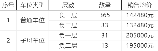 本次开盘全部可售车位700个,总面积21946.14㎡,本次开盘销售的全部可售产权车位均价145861元/个,各类型车位销售均价及数量明细如下: