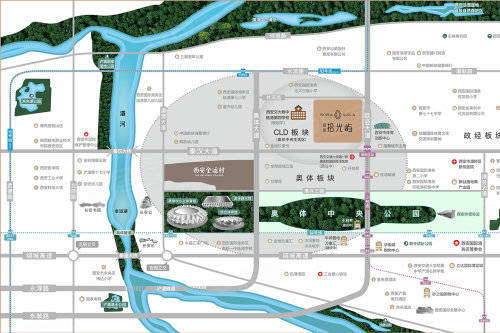 同时项目周边文化生态优质,东侧约 1.5 公里有陆港足球主题运动公园,项目西北侧约7公里可达浐灞国家湿地公园,西南侧约4公里即是西安奥体中心,不论是文化娱乐还是休闲活动,都选择多样。