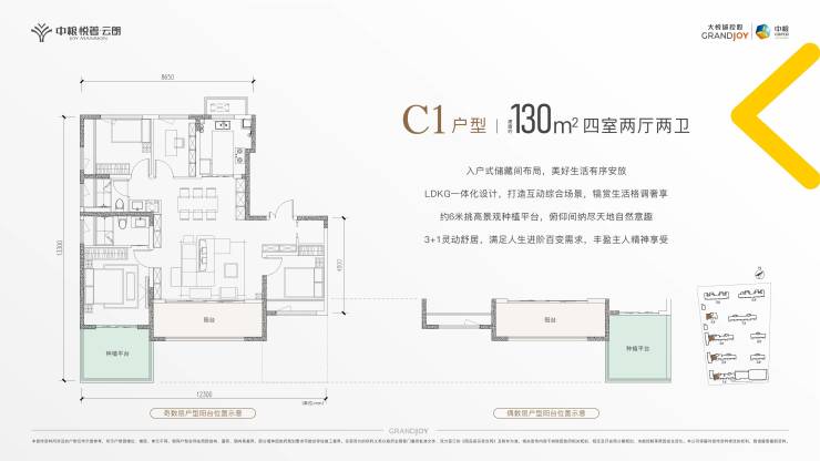 四代小高产品面积为130㎡和143㎡,每种户型分为奇数偶数层及边户中间户四种户型类别,品质高层产品面积为100㎡和116㎡,共计三种户型类别,同时社区整改地块南北长,东西短的布局让社区的空间拥有了更好的延展性,为业主打造出了一处拥有主轴礼序的社区。