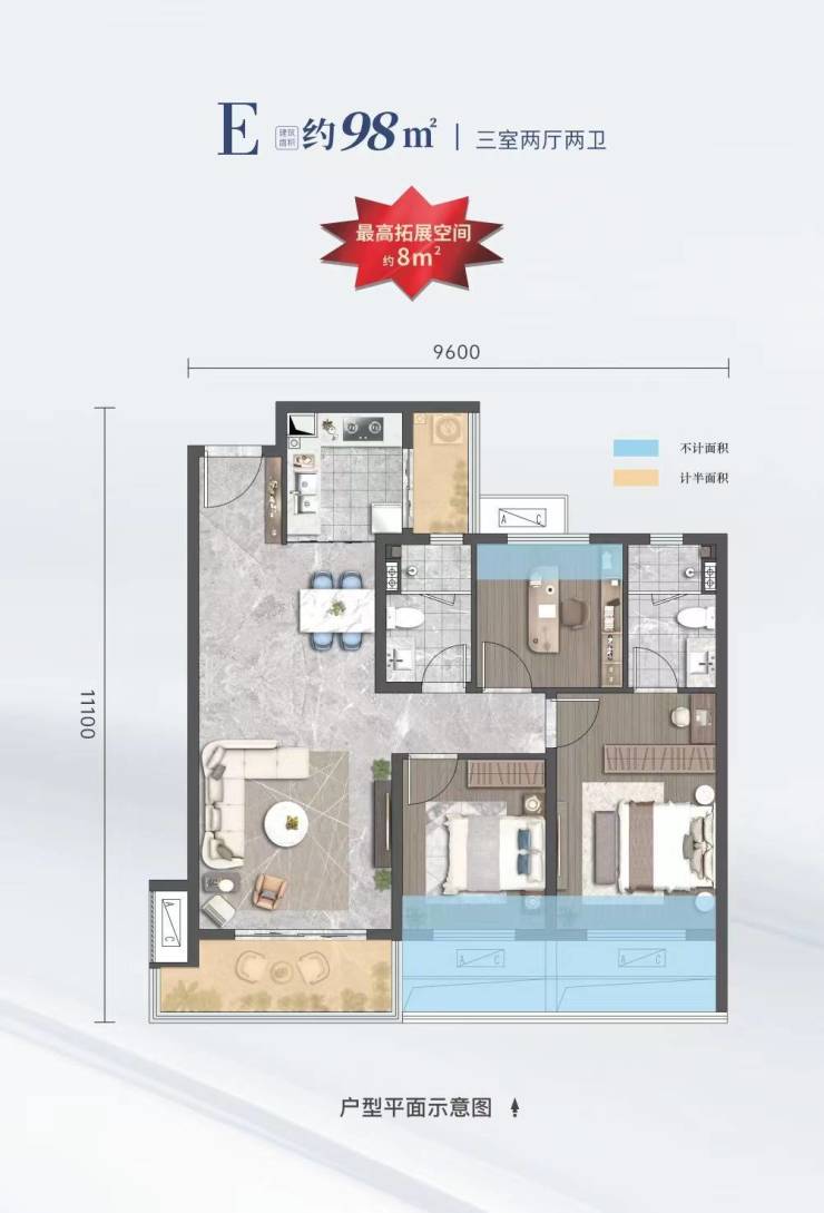 E户型98㎡三室两厅两卫
