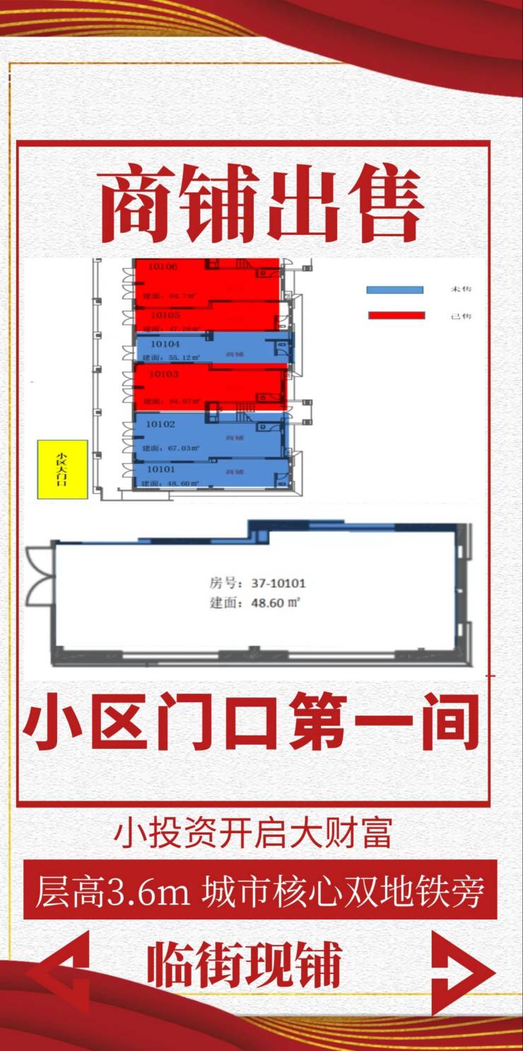 项目依托240万㎡社区,2万入住业主,10万潜在固定消费圈,4.4万㎡商业航母,25-480㎡临街现铺,产权清晰,低首付低门槛,轻松按揭做老板,5.6米空间挑高,买一层得两层。