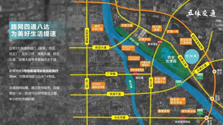 【交通配套】周边交通四通八达,项目距地铁3号线香湖湾站仅10分钟车程,项目门口10余条公交线路,可达城市东南西北各个核心区域。项目快速交通也十分便利,毗邻西安绕城高速,形成10分钟到港务、20分钟到经开、曲江、30分钟到高新、咸阳机场的高速城市干道,拉近了整个大西安距离。