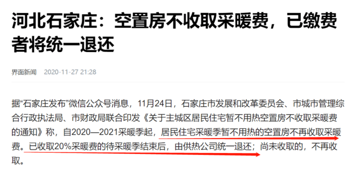 但现在很多城市没有空置费,比如河北石家庄,从2021年开始,不用热的空置房不再收取采暖费。已收取20%采暖费的待采暖季结束后,由供热公司统一退还。