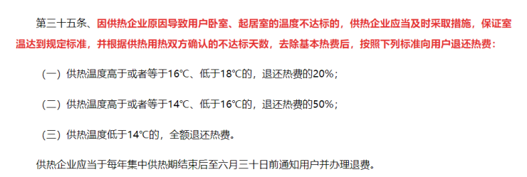 收费问题外,供暖温度不达标,入住率不够不给供暖,也困扰着不少业主。拿温度来说,根据西安市集中供热条例第三十条,供热企业要保证卧室、起居室温度不低于18度,供热低于16度的,要退费50%,低于14度的要全部退还。