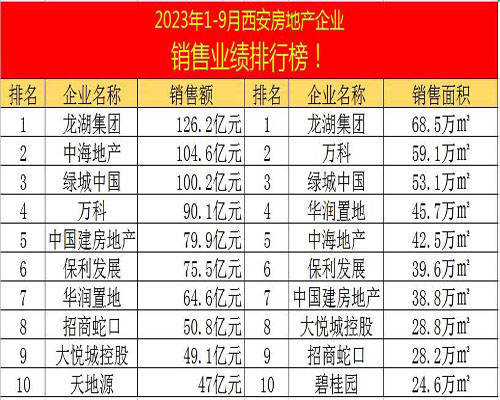 “龙湖”稳居榜首!23年1-9月西安房地产企业销售业绩排行榜!