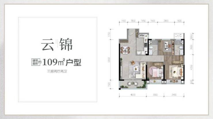 建面约109㎡户型,标准三室两厅两卫,约4.6米超大客厅+双270°瞰景阳台,采光、视野无遮挡,主卧套房设计,纯正的南北通透,飘窗、卧室、步入式衣帽间、三段式卫浴有序排列,功能性和尺度感完美兼容。