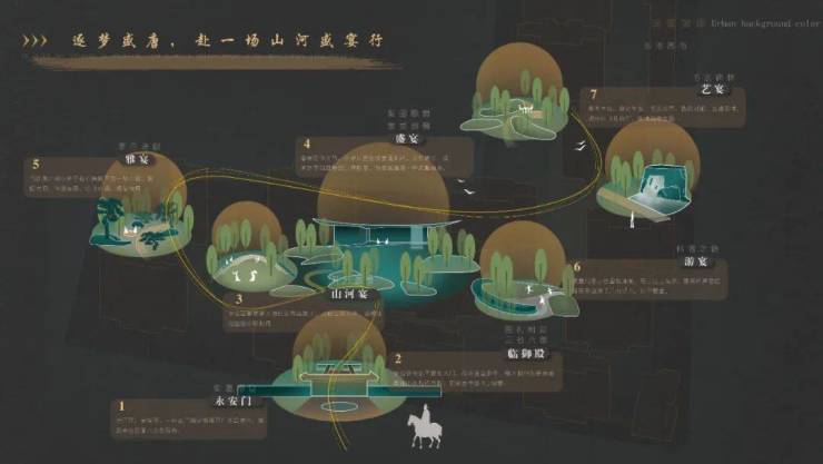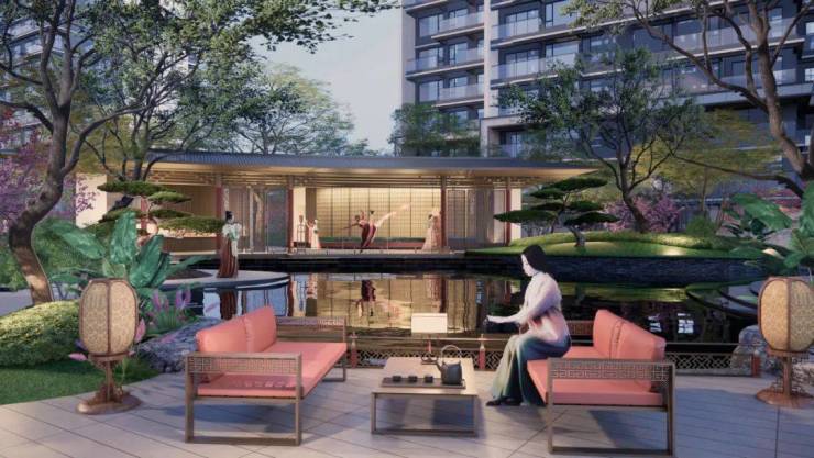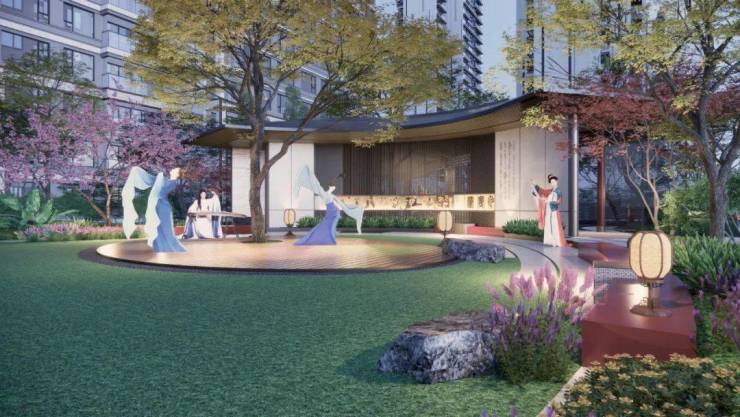 在曲径流水蜿蜒处,盛宴文化活动区、雅宴休闲交流区、游宴童梦童享区、艺宴青林庭院区、健身康养区一一铺陈,绿植树木苍翠处,唐诗、唐画、唐乐、唐书等元素无处不在,真如李太白诗歌所吟唱,“云想衣裳花想容,春风拂槛露华浓”。