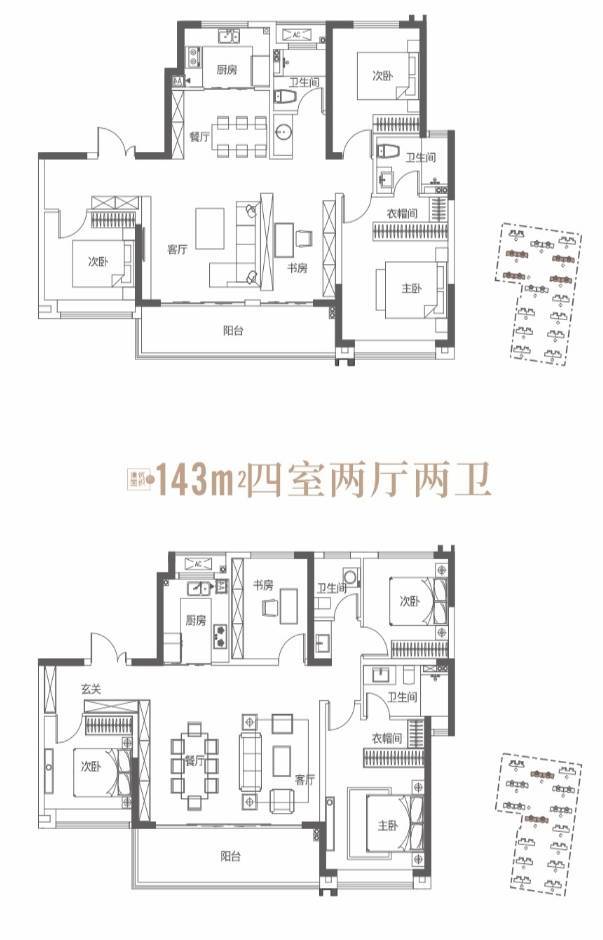 楼盘户型:4种户型,建面:100-143㎡ 4室2厅2卫
