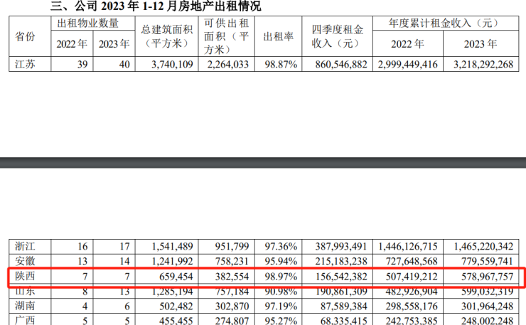 2023年,新城控股在陕西的出租物业有7个,分别是位于沣东新城、沣西新城、延安、宝鸡、安康、汉中、渭南的吾悦广场,总建筑面积约65.95万㎡,可供出租面积约38.26万㎡,出租率98.97%,租金收入约5.79亿元,排在全国各省份的第四位,仅次于其大本营江苏,以及同处长三角的省份浙江、安徽。