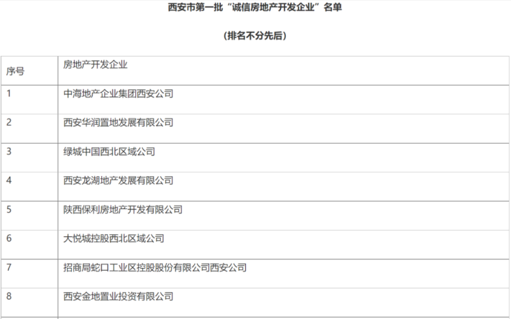 为贯彻落实《陕西省社会信用条例》《陕西省企业信用监督管理办法》等规定,进一步提高房地产开发企业诚信经营意识,规范房地产行业秩序,积极推进西安市房地产行业信用建设,鼓励先进、树立榜样,努力创建诚信规范的行业环境。经过前期调研、企业申报、征求意见等环节,形成西安市第一批“诚信房地产开发企业”名单,现予以公布。请各区县、西咸新区、开发区住建局统筹落实,切实支持诚信房地产开发企业发展。该名单实施动态管理,自发布之日起,有效期一年。