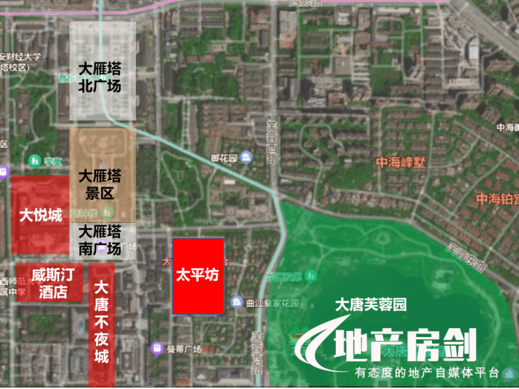 从这个项目所处的位置来看,可以说是真正的曲江核心位置,也是整个曲江一期少有的待开发地块。这个项目紧邻大雁塔景区、大唐不夜城、大唐芙蓉园,这些都已经是全国性的文化地标!