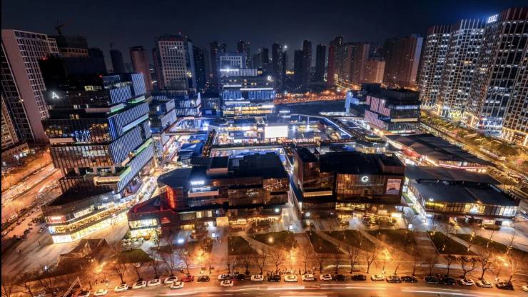 将盛唐建筑的恢宏形制与时尚的先锋主义融合重构。蓝棕石材与落地窗,交织出虚实相生的光影韵律。屋顶提取唐代建筑“官帽”形制,以平缓出挑的飞檐,勾勒出独特的天际线。细节处,以流线型鎏金铝板曲面锻造,再现盛唐的华贵气度与精湛工艺。