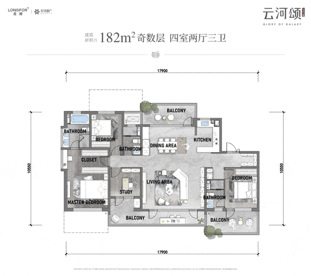 同面积更高使用功能,建筑面积约182㎡户型,是龙湖专为云河颂定制,有望入选今年西安最强约180㎡户型之一。