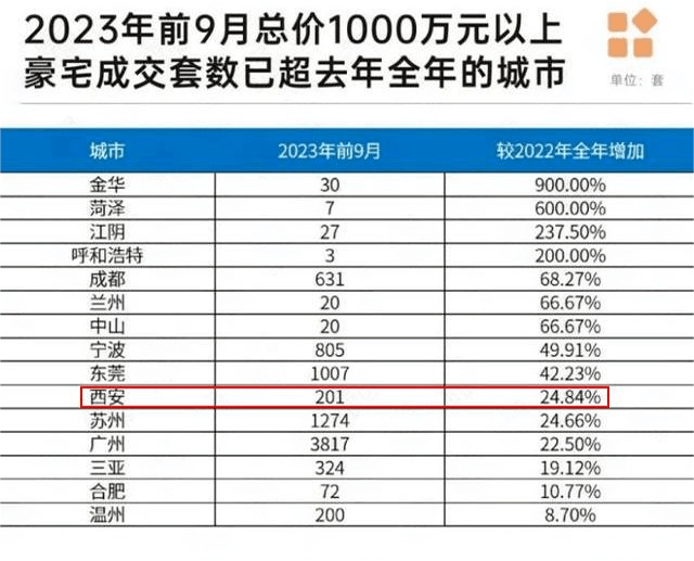 数据来看,2023年前9月总价1000万元以上豪宅成交套数已超去年全年的城市,西安赫然在列,成交201套,比去年全年增加24.8%!