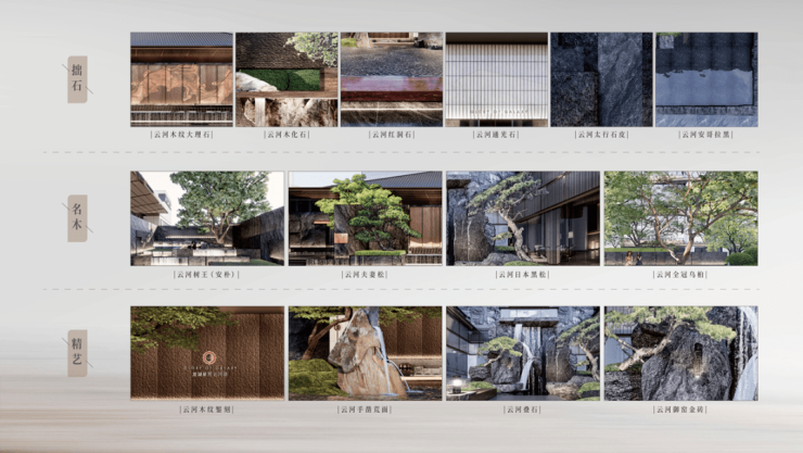 真正的高端住宅,懂得把钱花在材料上,细到每一棵树木、每一块石材,都极为严苛。未来之瞳·云河颂,遴选珍稀木纹石、红洞石等天然石材,顶级典藏双松、云河树王(朴树)等珍惜树木,再辅以水刀拼花工艺、金属镂雕工艺,历经纯手工石材手凿等千百道工序、数百次毫米级研磨,终成经典。