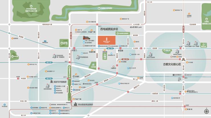 伴随西电东区区块的更新规划(定位为宜居宜业的品质社区和产创高地),大庆路与桃园路作为区域内无可替代的"黄金十字心”,同步承接片区发展势能,将主城与城市核心产业区紧密连接,推动区域跃升为西安未来主城版图中的活力新中心。