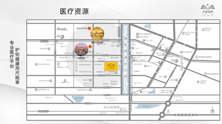 高新医院距离项目仅900m,高新医院位于西安是一所集医疗、教学、科研、预防、保健为一体的股份制综合医院。