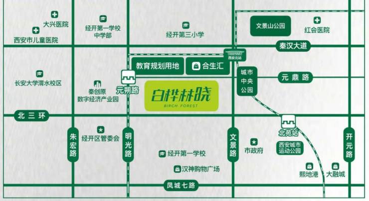 白桦林晓位于经开核心地段,经开区管委会,距西安北站,4号线(元朔路站)、2号线(北苑站)双地铁通达,步行即达西安北站,车程达咸阳机场,便捷出行。