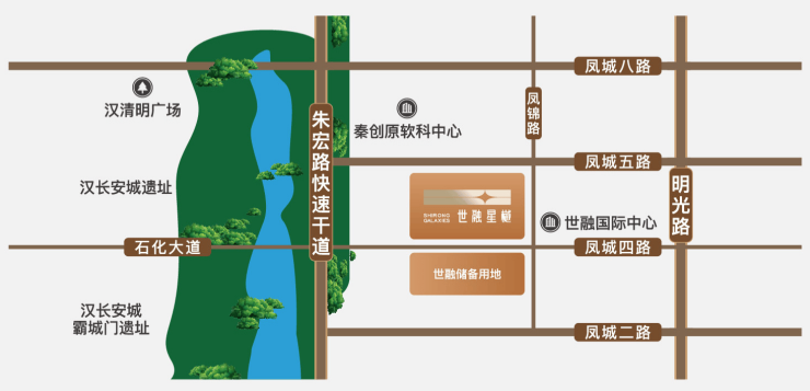 世融星樾择址迎宾大道朱宏路与凤城五路十字尊享轴线、经开中心区极为稀缺区域、汉长安城之青龙位、市府圈政经命脉等核心资源圈,在经开土地极少的中心区之上,以传世之心打造传世之作。