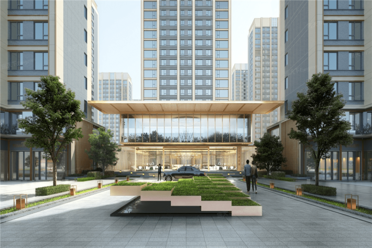 项目效果图,可以看到整体建筑主色调,大门充满科技感,通体设计大面积的玻璃外墙,放眼整个片区内,绝对是地标级的存在。