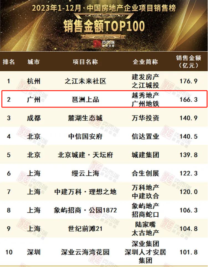 2023年1-12月中国房地产企业项目销售金额TOP100中,越秀地产琶洲上品,以销售金额166.3亿元,登顶全国第2。同时更在千万+级高端改善产品领域,成为全国TOP1的流量之王。