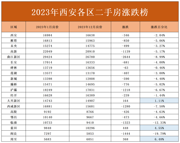 16跌3涨?2023年西安各区域房价涨跌榜曝光!高新区港务区也扛住不了?