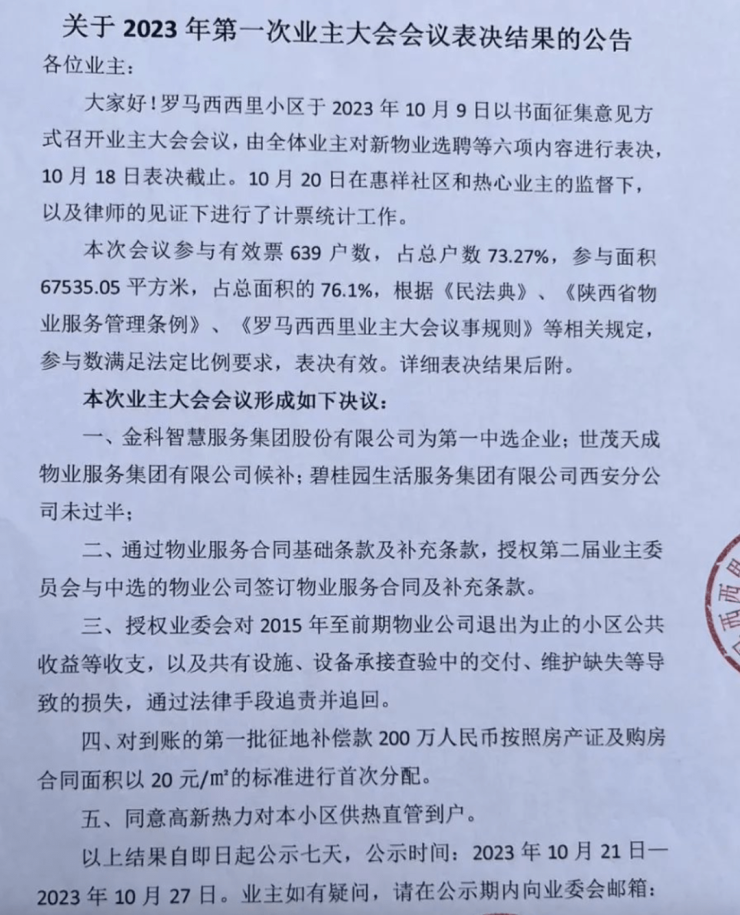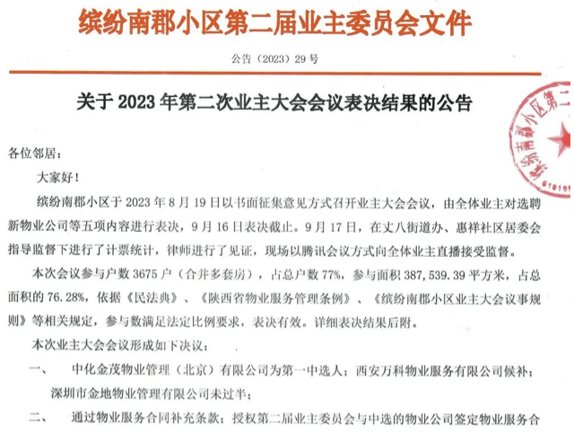 在9月17日,小区业委会公众号发布了表决结果,共3675户业主参与,占总人数的77%,最终中化金茂物业管理(北京)有限公司为第一中选人,西安万科物业服务公司候补。