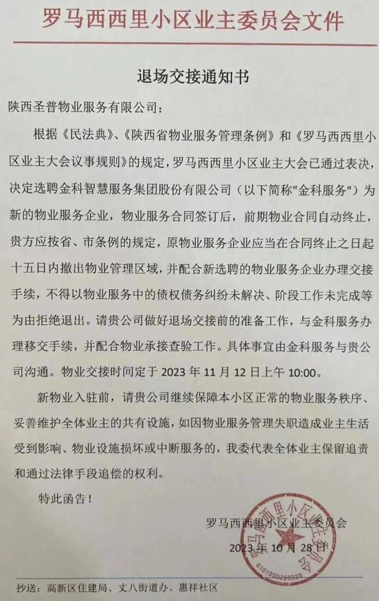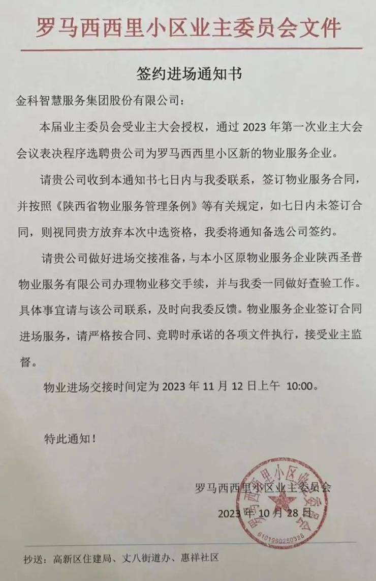 随即小区也发布了新物业签约进场通知书、退场交接通知书和协调监督移交请求函,物业交接时间定为11月12日。