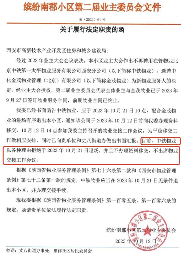 9月26日,小区发布通知,新物业进场交接时间为2023年10月21日,原物业却以各种理由拒绝退场,且不办理资料移交,不配合交接。