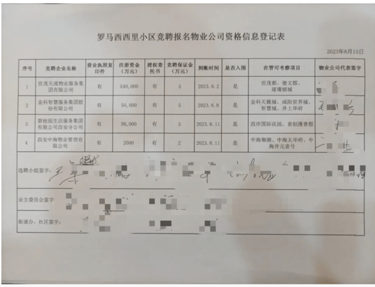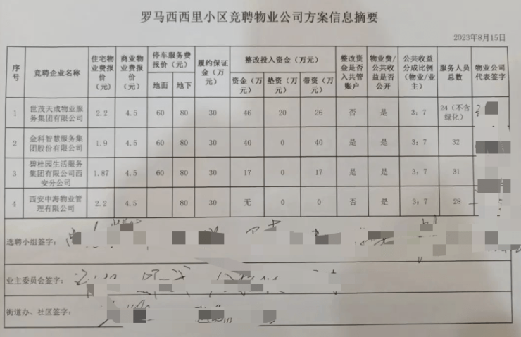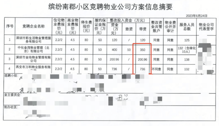 该小区在今年6月就开始启动新物业公司的选聘工作,7月发布招聘公告,引来了世茂、金科、碧桂园、中海4家物业公司参与竞聘,分别带资26、40、17、0万元,由业主投票选出新物业公司。